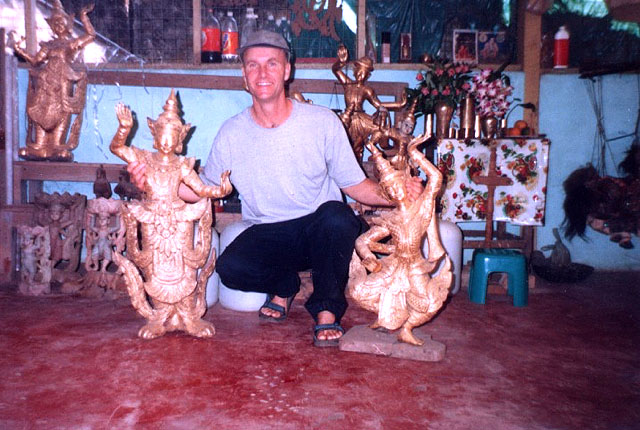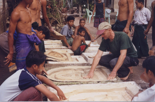 He returned in 1995, and again in 1996 as a tourist. In 1997, he went back to Myanmar with a business visa to have woodcarvings made of Myanmar designs. He made rubber molds of the woodcarvings and sold concrete copies in the town of Bolinas California where he lives. He loved the mold making process and the beautiful art that he was reproducing. David returned to Myanmar again in 1998 to have more woodcarvings made for the purpose of making rubber molds and copies in concrete.